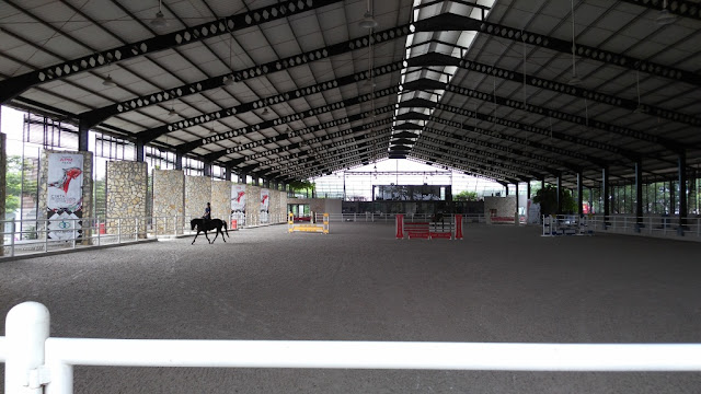 Selepas latihan, kami diajak berkeliling. Adria Pratama Mulya (APM) Equestrian Centre ini luasnya 7 hektar. Yang paling bikin kami penasaran tentu saja di mana kuda-kuda ini berada alias mana siii kandangnyaaaa. Kandangnya surprisingly sangat bersih. Kuda-kudanya sangat terawat, sehat dan bersih. Kudanya juga besar-besar, sangat besar dan gagah banget. Kebanyakan kudanya berasal dari luar Indonesia seperti Jerman, Andalusia, Australia, Belanda dan Amerika. Ada juga kuda asli Indonesia seperti kuda Sumbawa atau Padang. Tiap kandang pun hanya dihuni 1 kuda dan siang itu ada kipas angin yang menyala di tiap kandang, supaya kudanya ngga kepanasan cyiiin, hahaha. Mereka juga ngga main-main soal kesehatan kuda. Pernah pemilik APM mengadopsi kuda yang tadinya menarik delman. Waktu pertama masuk, kuda itu kurus dan tidak terawat. Dan kemarin waktu saya lihat ngga ada mirip-miripnya sama kuda delman. Cakep dan gemuk. :)) Dan mereka bahkan memanggil dokter dari Portugal (kalo ngga salah) untuk check up rutin kuda-kuda di sana. Beberapa artis dan pesohor juga banyak yang berkuda di sana.