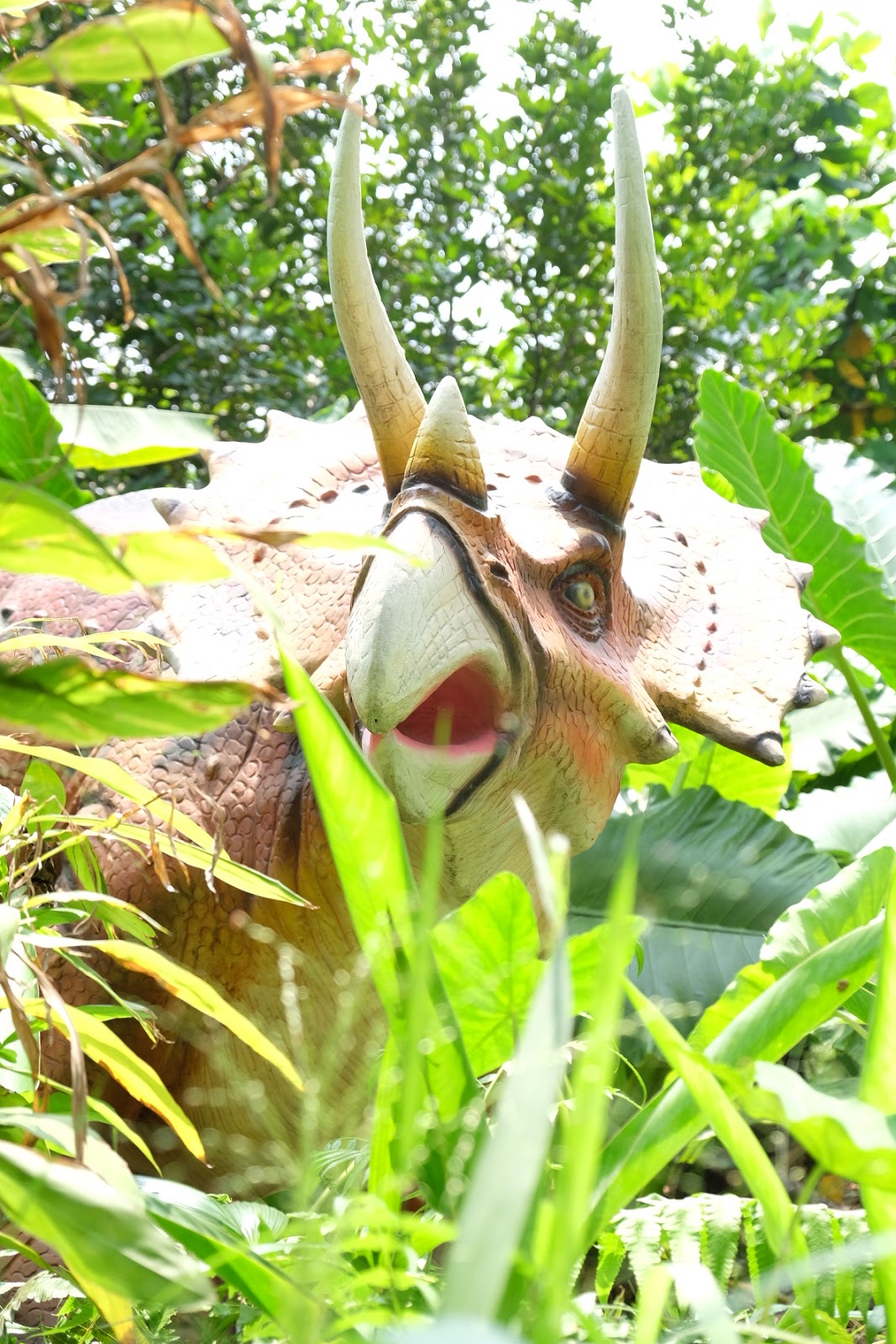 Dinosaurus pertama setelah melewati gate akan mengeluarkan air, jadi waspada yaaa karena airnya lumayan deras, hehehe. Dinosaurus itu bernama Dilophosaurus. Dilophosaurus hidup di Amerika Utara dan Cina sekitar 200 juta tahun yang lalu dan mempunyai tinggi 1,5 meter dan panjang 6 meter. Namanya lainnya kocak sih Kadal Berjambul Ganda, hahaha. Yang menarik dari dinosaurus yang ada di dalam Petualangan Dinosaurus adalah hewan purba ini ditata sedemikian rupa di dalam semak belukar ataupun pepohonan seperti hutan. Jadi memang seperti dibuat menyerupai petualangan di hutan berisi dinosaurus.